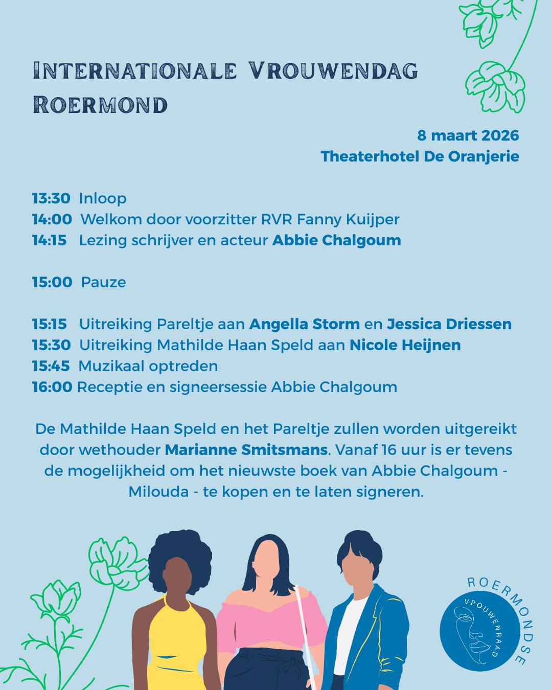 Deze middag zullen wij de Mathilde Haan Speld uitreiken aan Nicole Heijnen. Ook ontvangen Jessica Driessen en Angella Storm het Pareltje van Roermond.